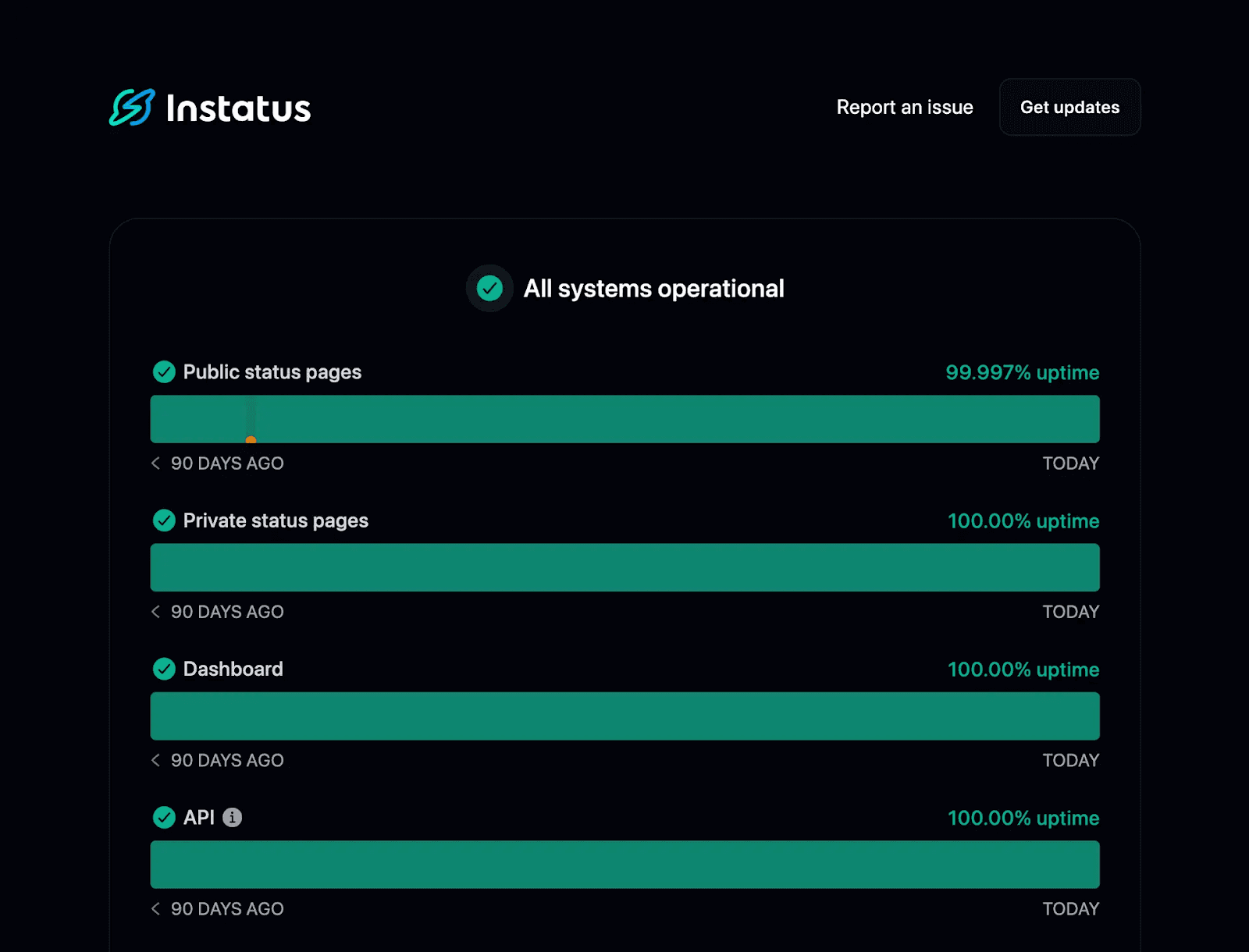 Instatus revolutionises incident communication by combining powerful monitoring capabilities with beautiful, fast-loading status pages. Our platform helps busy SaaS teams, DevOps engineers, and developers maintain transparent communication during incidents while reducing support ticket volume.