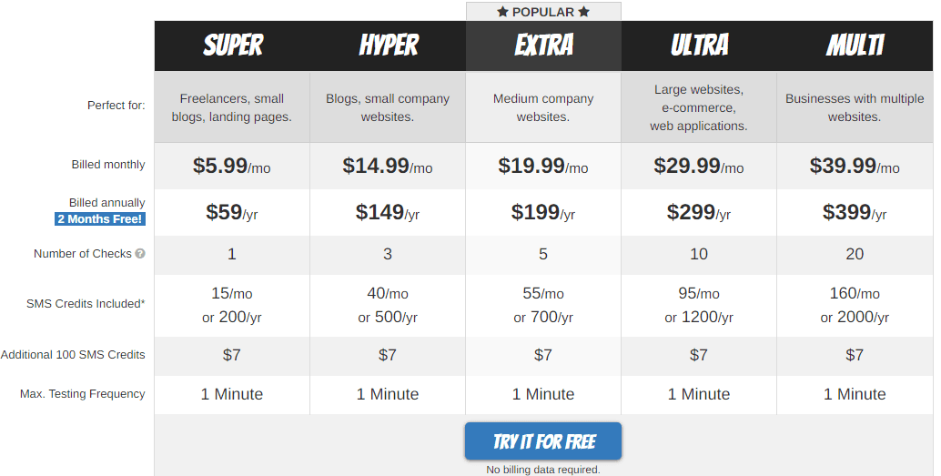 - Hyper: $14.99 per month. Includes 3 checks, 40 SMS credits per month, and a maximum testing frequency of 40 per month.